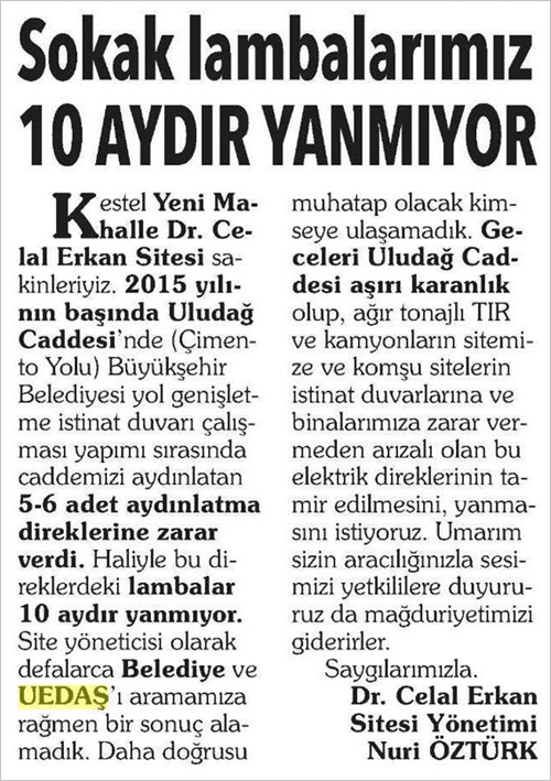 Sayın Günay Yumruktay, geçtiğimiz günlerde köşenizde yayınladığınız okur talebinde Kestel’e bağlı Uludağ Caddesi’nde yaklaşık bir kilometrelik yolda bulunan aydınlatma direklerine ait şebekenin yol genişletme çalışmaları sırasında zarar görmesi nedeniyle lambaların uzun bir süredir yanmadığı belirtilmişti. Okur talebinde site sakinleri karanlığa bağlı olarak mağduriyet yaşadıklarını belirterek aydınlatmaların faal hale getirilmesini talep etmişlerdi.
