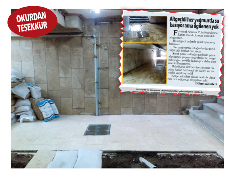 18 Haziran 2022 tarihinde Söz Sizde köşenizde bölge sakinleri olarak “Altgeçidi Her Yağmurda Su Basıyor Ama İlgilenen Yok” başlığıyla Ankara Yolu Koğukçınar Zabıta Karakolu’nun önündeki altgeçidin ve çevredeki altgeçitlerin sıkıntılı durumunu anlatan yazımız yayımlanmıştı.