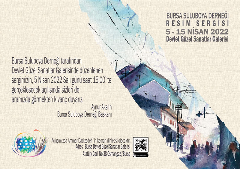 2019 yılında Bursa’da profesyonel ve amatör sanatçılar arasından resim sanatının suluboya tekniğine gönül verenler tarafında kurulan Bursa Suluboya Derneği, 2022 yılının ilk sergisini Bursa Devlet Güzel Sanatlar Galerisi’nde 5 – 15 Nisan 2022 tarihlerinde sanatseverlere sunuyor.