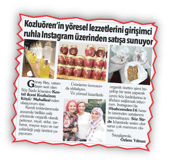 Özlem Yılmaz, paylaştığımız yazısında; “Söz Sizde köşesine Kestel ilçesi Kozluören Mahallesi’nden ulaşıyorum size. Kendi imkânlarımızla annemle birlikte atalarımızdan kalma yöntemle organik olarak pekmez, reçel, sirke, tarhana, meyve suyu ve nar çekirdeği yağı üretimi yapıyorum. Ürünlerim konusunda iddialıyım. @bahcemden16 Instagram sayfamdan satış yapmaktayım’ diyor ve ‘Köşenizde sesim olursanız çok memnun olurum’ diyordu.