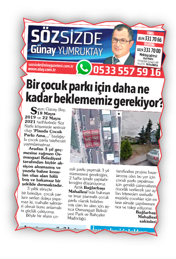 Sayın Günay Yumruktay, Olay gazetesinin 22 Temmuz 2022 tarihli Söz Sizde köşesinde ‘Bir Çocuk Parkı İçin Daha Ne Kadar Beklememiz Gerekiyor?’ başlıklı bir şikâyete yer verilmiştir.