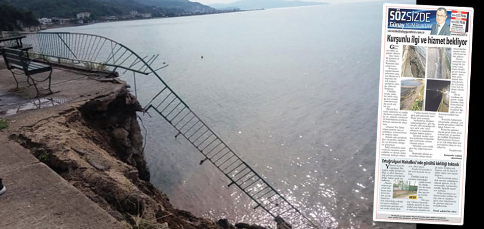 Önceki gün Gemlik ilçesi Kurşunlu Mahallesi’nden Söz Sizde köşesine ulaşan Harun Gavaz adlı okurum, Kurşunlu’da sahil yolunun durumunu sıkıntılı olduğunu, kaldırımın denize doğru çökmeler olduğunu belirtmişti.
