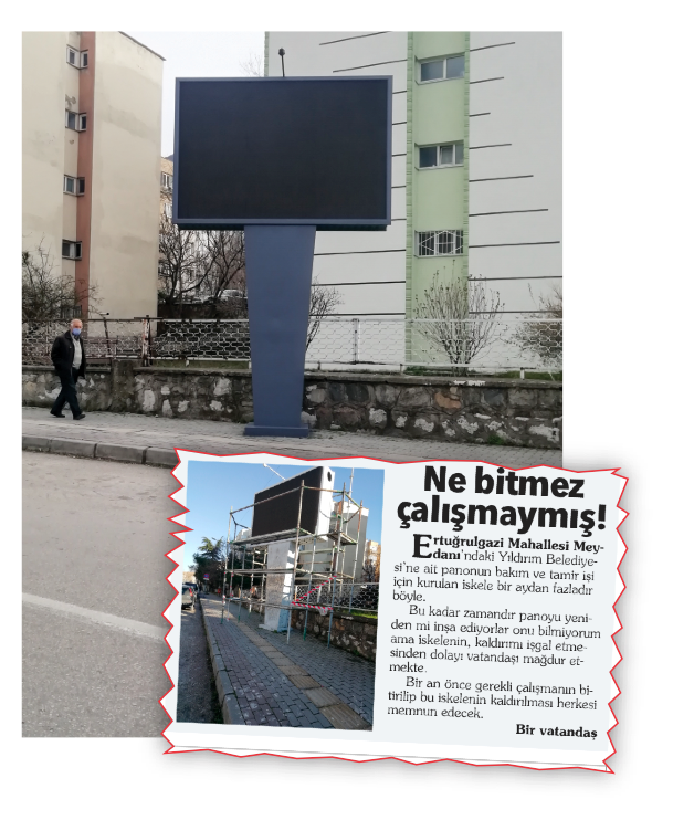 Günay Bey, 11 Aralık 2021 tarihinde Söz Sizde köşesinde yer alan Yıldırım ilçesi Ertuğrulgazi Mahallesi Meydanı’nda bulunan Yıldırım Belediyesi’ne ait pano çevresindeki iskelenin uzun süredir vatandaşı zor durumda bıraktığıyla ilgili şikâyetim sonrası Yıldırım Belediyesi tarafından panonun boyama işi bitirilmiş ve iskele kaldırılmıştır.