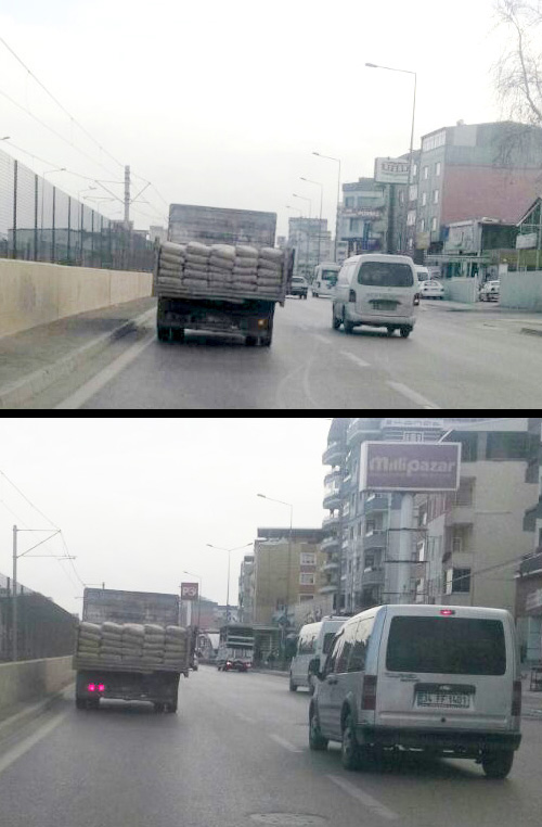 Sevgili Günay Yumruktay, fotoğrafları Ankara yolunda çektim. Önümde giden kamyonetin arkası çimento torbalarıyla yüklü. Ama trafik güvenliği adına alınmış hiçbir önlem yok. Görüldüğü gibi kamyonetin arka kapağı açık. Seyir halindeyken ya o çimento torbaları kayıp yola düşse!.. Arkadan gelen sürücülerin ‘Vay haline”… Bu vurdumduymazlık, sorumsuzluk belki çok kötü bir faciaya yol açacak.