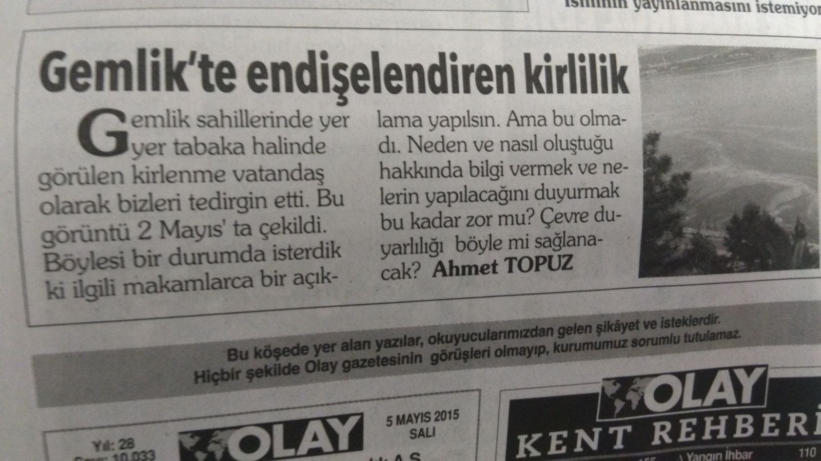 Gemlik Körfezi’nde deniz üzerinde bir süredir görülen renk değişikliğinin vatandaşlar arasında tedirginlik yarattığını, buna rağmen yetkililerce açıklama yapılmamasının duyulan tedirginliği artırdığını önceki gün fotoğraf eşliğinde duyurmuştuk. Büyükşehir Sahil Hizmetleri Dairesi yerinde inceleme yaparak, körfezde temizlik çalışmalarına başladı. Deniz üzerinde görülen kırmızımsı renk ile kıyıya vuran kahverengi birikintinin herhangi bir karasal ya da gemi atığı (sızıntısı) olmadığı, söz konusu görünümün denizlerde bu mevsimde görülen ve literatürde ‘alg patlaması’ veya ‘kızıl akın’ olarak tarif edilen doğal bir seleksiyon sonucu oluştuğu tespit edildi. Endişeye gerek olmadığı da vurgulandı. Uyarımızın ardından işlemleri süratle yerine getiren ve açıklamada bulunan Büyükşehir yetkililerine teşekkürler.