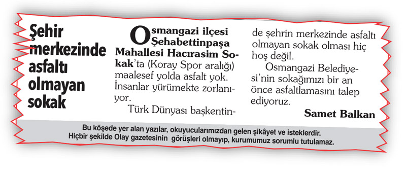 Sayın Günay Yumruktay, Olay gazetesinin 6 Eylül 2022 tarihli Söz Sizde köşesinde ‘Şehir Merkezinde Asfaltı Olmayan Sokak’ başlıklı bir şikâyete yer verilmiştir.