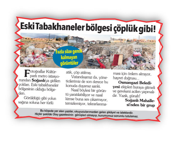 18 Ağustos 2022 tarihli Söz Sizde köşesinde ‘Eski Tabakhaneler Çöplük Gibi!’ başlıklı bir şikâyete yer verilmiştir.