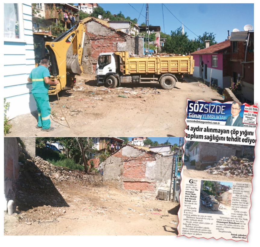 Sayın Günay Yumruktay, Olay gazetesinin 14 Ağustos 2020 tarihli Söz Sizde köşesinde ‘4 Aydır Alınmayan Çöp Yığını Toplum Sağlığını Tehdit Ediyor’ başlıklı bir şikâyete yer verilmiştir.
