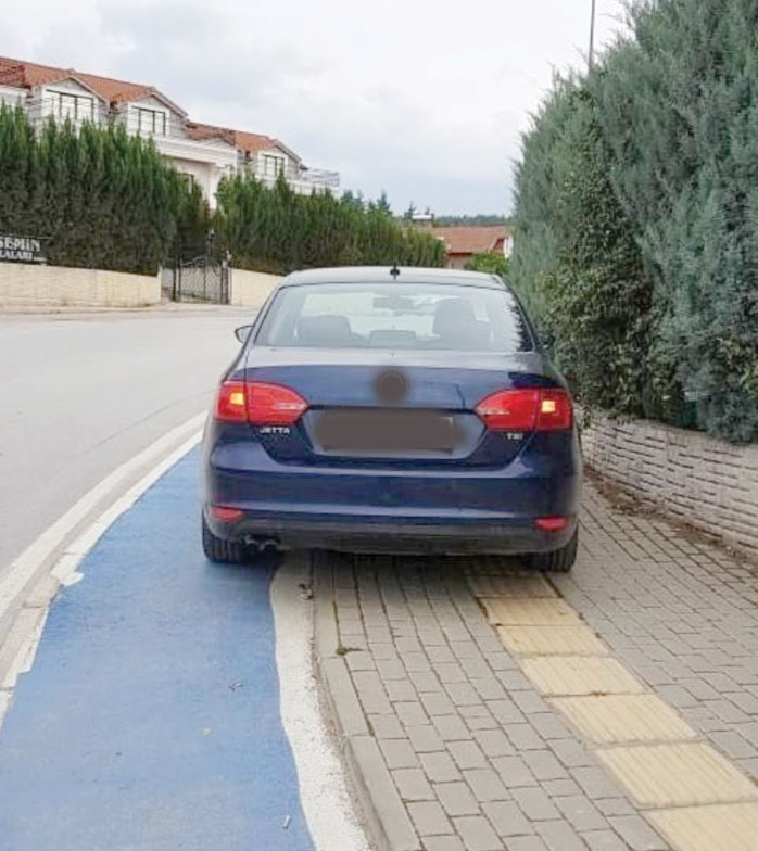 Fotoğrafta da görüldüğü gibi, sürücü bisiklet yolunu kapatmış, yetmemiş kaldırıma çıkmış o da yetmemiş kaldırımdaki engelli yolunu da işgal etmiş.
