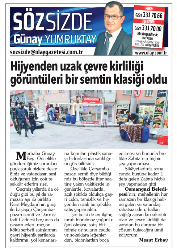 Sayın Günay Yumruktay, 24 Nisan 2021 tarihli Söz Sizde köşenizde yayımlanan “Hijyenden Uzak Çevre Kirliliği Görüntüleri Bir Semtin Klasiği Oldu” başlıklı yazı üzerine açıklama gereği duyulmuştur.