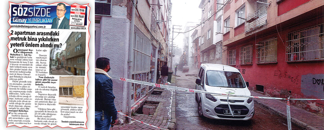 Günay Bey merhaba, 9 Nisan 2021 tarihli köşe yazınızda “2 Apartman Arasındaki Metruk Bina Yıkılırken Yeterli Önlem Alındı mı?” başlığıyla yer alan konu, ilgili müdürlüğe iletilmiş olup, gelen cevap aşağıda sunulmuştur.