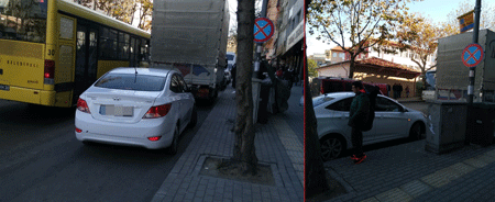 ‘Duraklamak ve Park Etmek Yasaktır’ tabelasının dibinde park eden, haliyle duran araçlar.