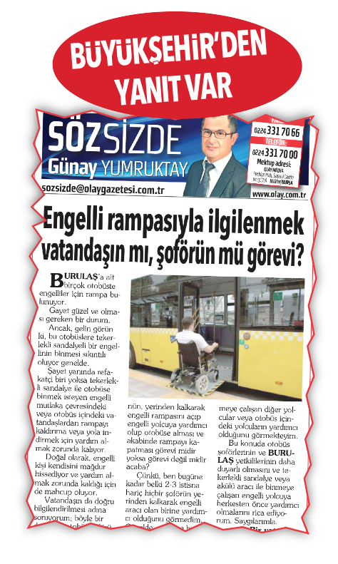 Sayın Günay Yumruktay, 24 Şubat 2022 tarihli Olay gazetesi Söz Sizde köşesinde yayımlanan “Engelli Rampasıyla İlgilenmek Vatandaşın mı, Şoförün mü Görevi?” başlıklı konu, kurumumuz ilgili birimi tarafından incelenmiştir.
