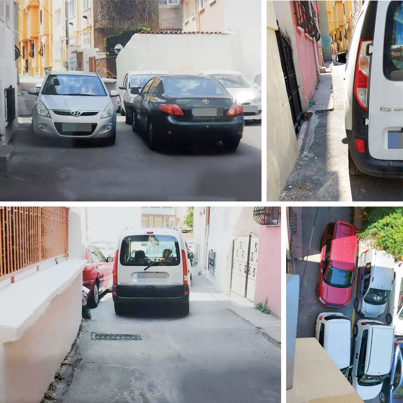 Bulunduğumuz sokakta özel bir otopark mevcut. Ancak, bu işyeri sahipleri, kapımızın önünden geçen belediyenin yol olarak tahsis ettiği, kamunun kullandığı alanı dahi otopark olarak kullanarak yolu işgal eder hale geldiler.