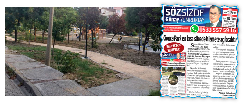 Günay Bey, Nilüfer ilçesi Beşevler’deki Gonca Park ile ilgili 29 Temmuz 2022 tarihinde yayımlanan yazımdan sonra 1 Ağustos 2022 tarihinde Nilüfer Belediyesi’nin açıklamasını okuduk.
