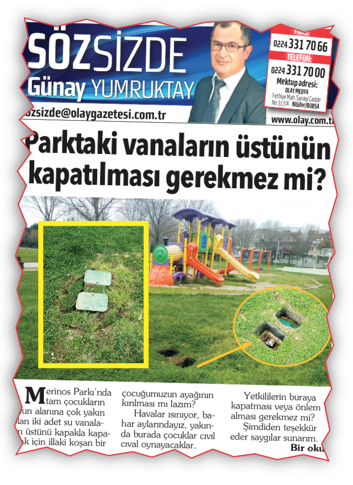 8 Nisan 2021 tarihinde Söz Sizde köşesinde yayımlanan “Parktaki Vanaların Üstünün Kapatılması Gerekmez mi?” başlıklı yazım üzerine yetkililer hemen ertesi gün sorunu giderdiler, parktaki tehlike yaratan açık vanalar kapatıldı. İlgilenenlere, çok kısa sürede sorunu çözdükleri için yine Söz Sizde köşesi aracılığıyla teşekkür ediyorum.