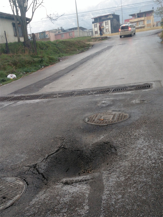 Hacivat Mahallesi 201. Sokak girişi. Asfalt yolda, fotoğrafta da görülebileceği gibi çökme mevcut. 2 aydır durum böyle fakat hiç kimsenin ilgilendiği yok.