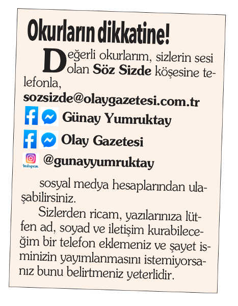 Sayın Günay Yumruktay, Olay gazetesinin 29 Aralık 2019 tarihli Söz Sizde köşesinde ‘8 Ay Önce Yıkılan Yerin Molozları Hâlâ Duruyor’ başlıklı bir şikâyete yer verilmiştir.