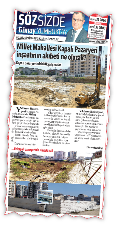 5 Mart 2020 tarihli gazetenizin Söz Sizde köşesinde yayımlanan “Millet Mahallesi Kapalı Pazar Yeri İnşaatının Akıbeti Ne Olacak?” Başlıklı okur şikayeti Belediyemiz Kentsel Tasarım Müdürlüğü’nce incelenmiştir.