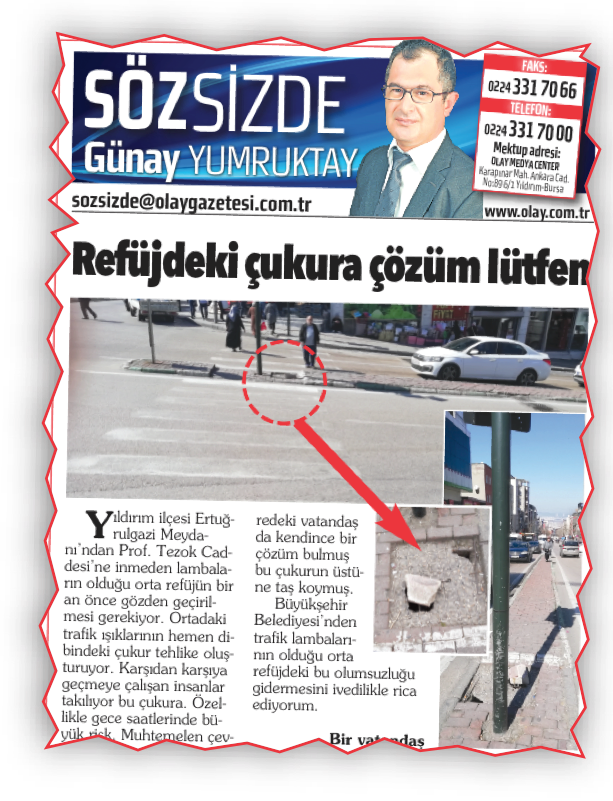 10 Mart 2020 tarihinde gazetenizin Söz Sizde köşesinde yayımlanan “Refüjdeki Çukura Çözüm Lütfen” başlıklı yazımız üzerine ilgili ekipler kısa sürede tehlike oluşturan çukuru kapatmıştır.