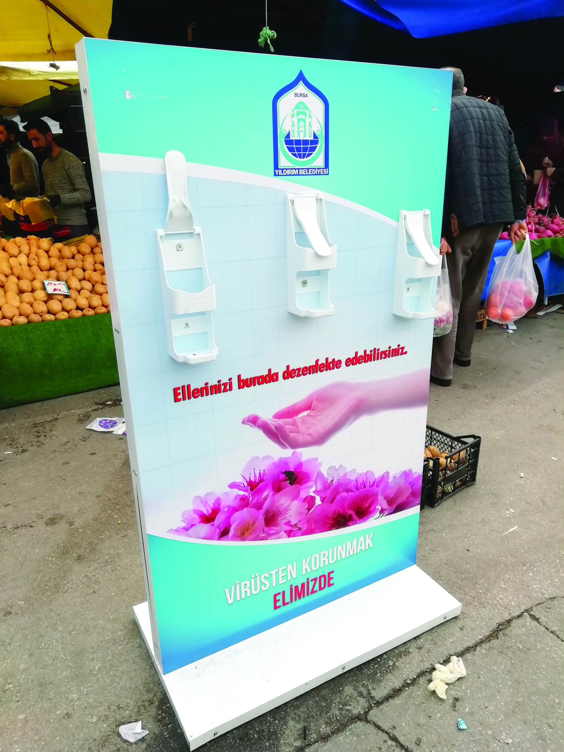 Pazarın bir girişine Yıldırım Belediyesi dezenfektan standı koymuş. Yanında bir görevli.