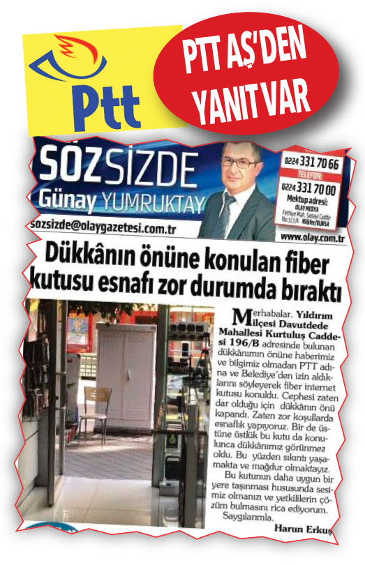 Sayın Günay Yumruktay, 25 Ağustos 2021 tarihli gazetenizde yer alan “Bursa Yıldırım ilçesi Davutdede Mahallesi Kurtuluş Caddesi 196/B adresinde bulunan dükkânın önüne PTT adına fiber internet kutusu konulduğu” yönünde çıkan okur şikâyetinin yer aldığı köşe yazınıza istinaden şirketimiz tarafından açıklama yapılmasına ihtiyaç duyulmuştur.