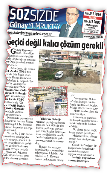 Sayın Günay Yumruktay, Olay gazetesi “Söz Sizde” köşesinde 5 Ağustos 2020 tarihinde yayımlanan ‘Geçici Değil, Kalıcı Çözüm Gerekli’ başlıklı konu, kurumumuz ilgili birimi tarafından incelenmiştir.