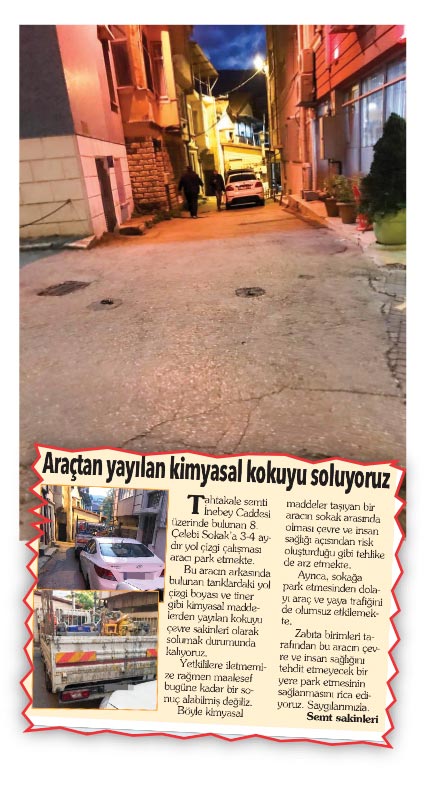 Günay Bey, 24 Ekim 2021 tarihinde Söz Sizde köşesinde “Araçtan Yayılan Kimyasal Kokuyu Soluyoruz” başlığıyla Tahtakale semti İneböy Caddesi üzerinde bulunan 8. Çelebi Sokak’taki mağduriyetimizi ifade eden yazımızın yayımlanması üzerine bahse konu olan araç sokaktan ayrılmıştır.
