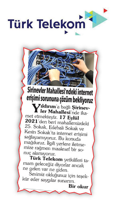 13 Ekim 2021 tarihli Söz Sizde köşesinde “Şirinevler Mahallesi’ndeki İnternet Sorununa Çözüm Bekliyoruz” başlığıyla bir okur yazısına yer vermiştim.