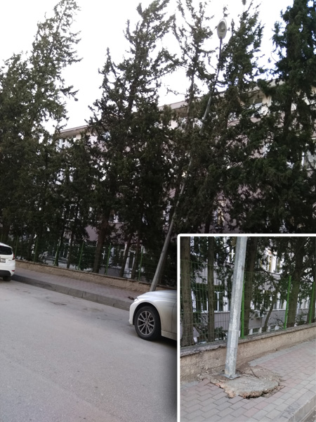 Fotoğrafta görülen yer Prof. Tezok Caddesi 1. Hastane Sokak Yüksek İhtisas Hastanesi’nin arka tarafı. Çam ağaçlarının arasına sıkışmış halde kalan sokak aydınlatma direğinin çakılı olduğu beton yerinden kopmuş durumda. Dünkü lodosta yaprak gibi sallanıyordu.