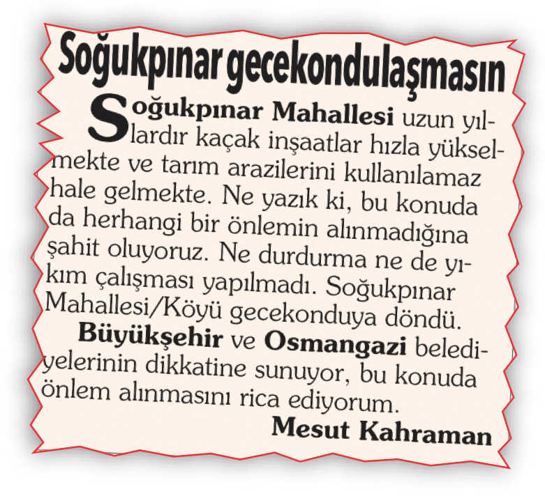 Sayın Günay Yumruktay, Olay gazetesinin 27 Aralık 2019 tarihli Söz Sizde köşesinde ‘Soğukpınar Gecekondulaşmasın’ başlıklı bir şikâyete yer verilmiştir.