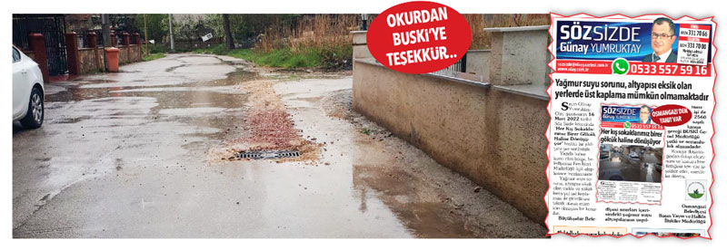 16 Mart 2022 tarihinde Söz Sizde köşesinde “Her Kış Sokaklarımız Birer Gölcük Haline Dönüşüyor” başlığıyla yayımlanan ve mağduriyetimizi ifade eden yazımızdan sonra, 5 Nisan 2022 tarihinde Osmangazi Belediyesi konuya duyarlılık göstermiş ve “Yağmur Suyu Sorunu, Altyapısı Eksik Olan Yerlerde Üst Kaplama Mümkün Olmamaktadır” başlığıyla verdiği yanıtta konunun BUSKİ’nin yetki ve sorumluluğunda olduğunu belirtmişti.