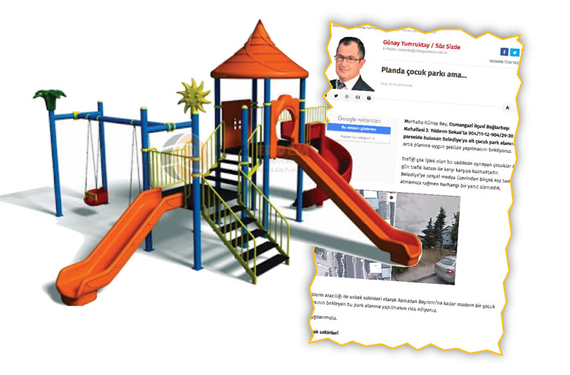 İmar planında da çocuk parkı olan planlanmış, Osmangazi Belediyesi Park ve Bahçeler Müdürlüğü tarafından da projelendirilen çocuk parkının, yaz gelmeden kısa sürede yapılmasını Osmangazi Belediyesi’nden rica ediyoruz.