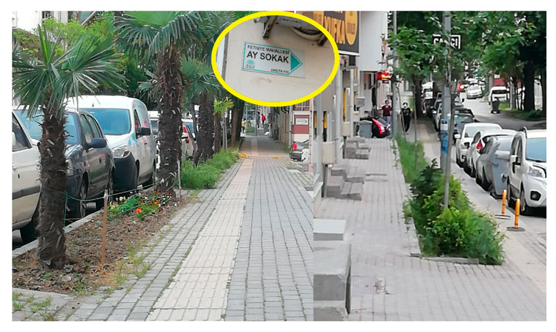 Ancak, ağaç diplerini öyle yabani otlar basmış ki kötü bir görüntü. Bir yer daha gördüm ki, muhtemelen çevredeki esnaf veya sakinlerinden biri, bu otlu yeri temizlemiş, bakım yapmış ve çiçeklendirmiş kendi imkânlarıyla. Çok güzel olmuş kaldırım.