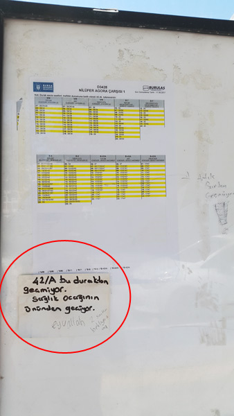 Vatandaşlar kendi notlarıyla otobüsün duraktan geçmediğini yazarak birbirlerini bilgilendiriyorlar. Yetkililerin bir an önce durak güzergâh ve saatlerini yenilemesini bekliyoruz.