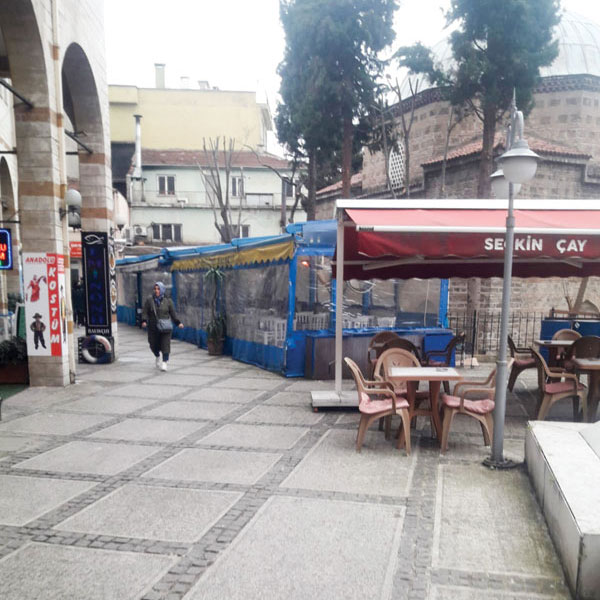 Cami ile Nilgün İşhanı arasında herkesin oturup dinlendiği, şadırvanın bulunduğu küçük park yeri oradaki esnaf tarafından naylonlarla çevrilerek işyerlerine dahil edilmiş durumda.