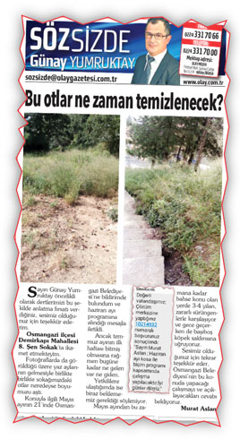 Sayın Günay Yumruktay, Olay gazetesinin 8 Temmuz 2021 tarihli Söz Sizde köşesinde ‘Bu Otlar Ne Zaman Temizlenecek?’ başlıklı bir şikâyete yer verilmiştir.