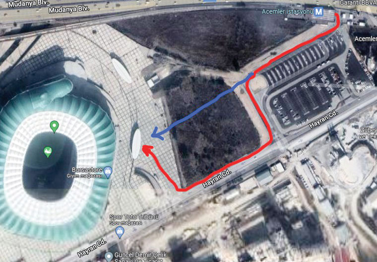 Size gönderdiğim şekilde de görüldüğü üzere Acemler-Bursaspor metro istasyonundan çıkan taraftarlar stada gidip gelirken kırmızı dolambaçlı uzun yolu kullanıyorlar.