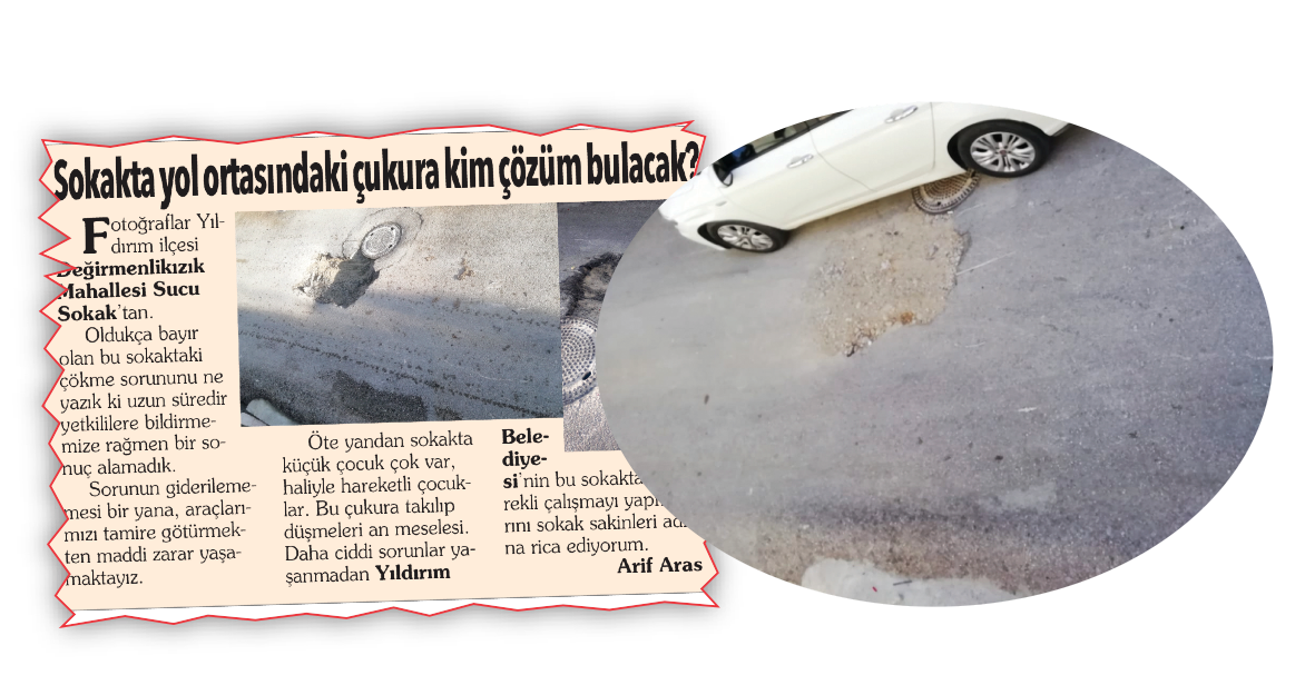Değirmenlikızık Sucu Sokak sakinleri olarak sokağın bu gidişle parça parça çökme tehlikesine karşı tamamen Yıldırım Belediyesi’nce yeniden asfaltlanmasını talep etmekteyiz.