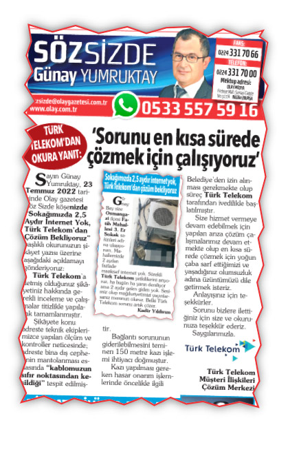 Günay Bey, 23 Temmuz 2022 tarihli Söz Sizde köşesinde “Sokağımızda 2,5 Aydır İnternet Yok, Türk Telekom’dan Çözüm Bekliyoruz” başlığıyla Osmangazi ilçesi Fatih Mahallesi 3. Er Sokak sakinleri olarak yaşadığımız sıkıntıyı paylaşmıştık.
