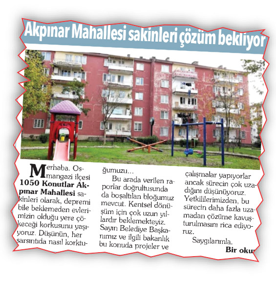 Sayın Günay Yumruktay, Olay gazetesinin 10 Ağustos 2022 tarihli Söz Sizde köşesinde ‘Akpınar Mahallesi Sakinleri Çözüm Bekliyor’ başlıklı bir şikâyete yer verilmiştir.
