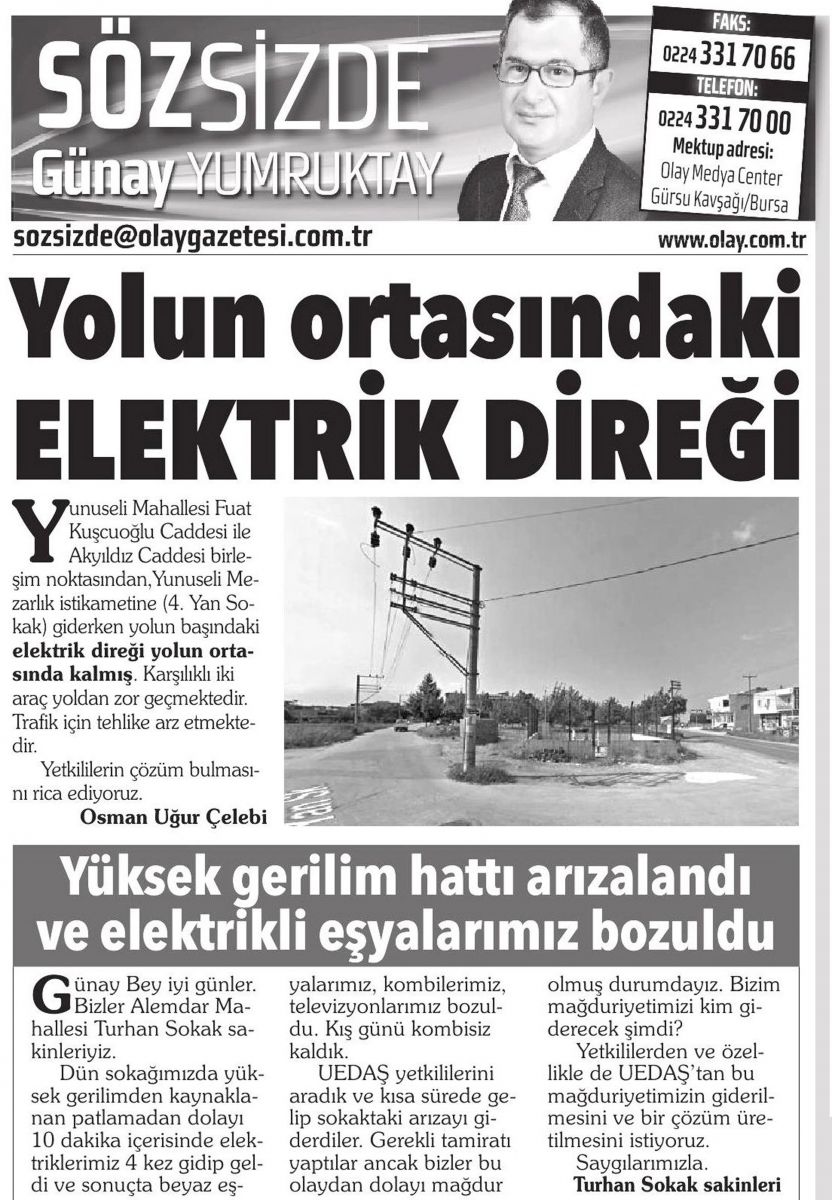Yunuseli Mahallesi’nde şikâyete konu yolda kalan direk ve şebeke bilgimiz dahilindedir. Bu yılki (2017) yatırım programımızda ilgili direğin projeli olarak deplase (yer değişikliği) edilmesi sağlanacaktır. Yüklenici firmaya yer teslimi yapılmış olup, kontrol mühendislerimiz tarafından süreç takip edilmekte ve denetlenmektedir.