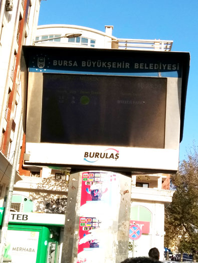 Yıldırım ilçesi Ertuğrulgazi Mahallesi’ndeki meydanda bulunan BURULAŞ otobüs güzergâh panosu arızalı. Yağmurda, tozda hemen arızalanıyor. Ya saatler görünmüyor, ya hat isimleri görülmüyor. Bu elektronik pano çok güzel bir hizmet, bu anlamda BURULAŞ’a teşekkür ediyoruz, ancak düzenli bakımının yapılması lazım. Ayrıca bazı kendini bilmezler tarafından ilan panosu gibi kullanılarak görüntü kirliliği de yapıyorlar.