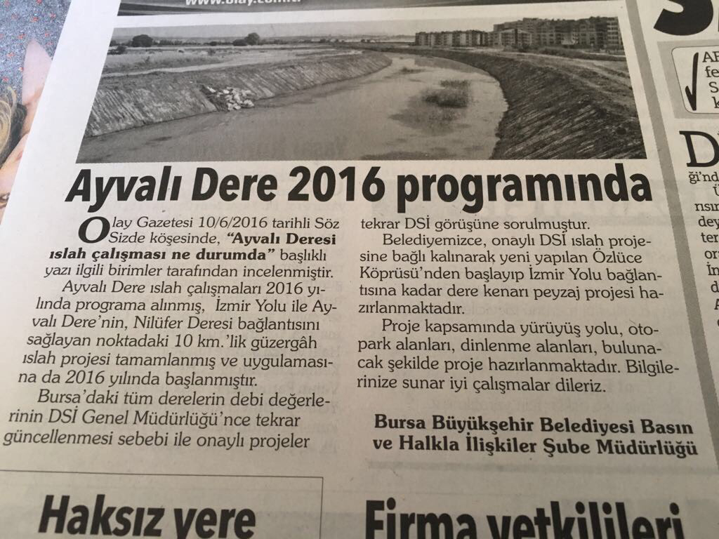 25 Haziran 2016’da ekte yer alan haber sizin köşenizde yayımlandı. Fakat herhangi bir çözüm veya çalışma yok. Ayvalı Dere ve çevresi için ne zaman düzenleme yapılacak? Yetkililer cevap verirse memnun oluruz.