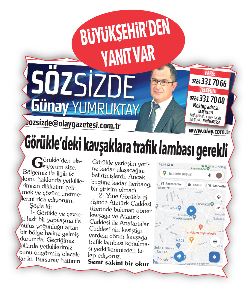 Sayın Günay Yumruktay, 6 Kasım 2021 tarihli Olay Gazetesi Söz Sizde köşesinde yayınlanan “Görükle’deki Kavşaklara Trafik Lambası Gerekli” başlıklı haber, kurumumuz ilgili birimi tarafından incelenmiştir.