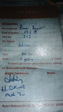 İznik Anadolu İmam Hatip Lisesi’nde çocuğumun yaşadığı olay hem üzücü hem de düşündürücü. Şöyle ki müdür yardımcısı H.O. okuldan dışarı çıkmak için kendisinden izin isteyen oğluma ‘eğer ölürsen sana izin veririm’ diye cevap vermiştir. Üstelik bununla da yetinmemiş izin kağıdına izin sebebi olarak’ölüm’ ibaresini yazmıştır. İmzaladığı bu belgeyi oğluma vermekte de bir sakınca görmemiştir.