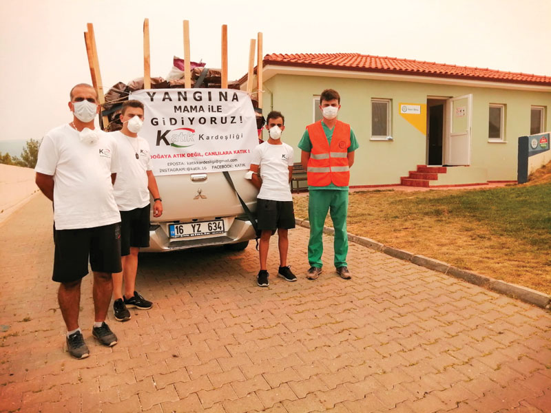 Bursa’da çeşitli okullarda yürütülen Katık Kardeşliği projesinin gönüllü öğrenci ve öğretmenleri 4 günlük bir çalışma ile topladıkları kuru mamaları yangından olumsuz etkilenen sokak hayvanlarına dağıtılmak üzere Muğla’ya götürdüler.