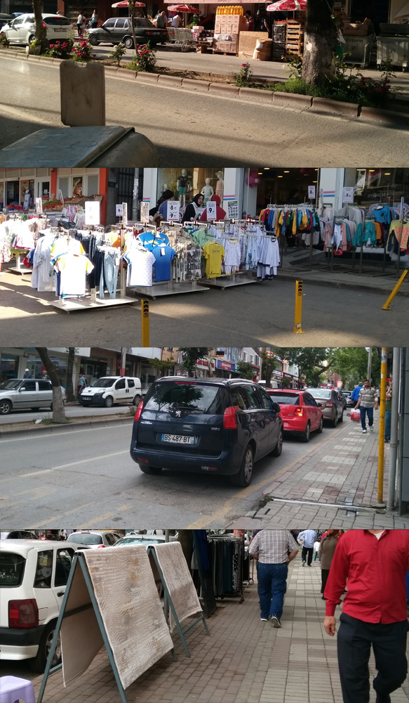 Özellikle büyük marketlerin ve mağazaların ürünleri kaldırımları işgal etmeye devam ediyor. Yine manav tezgâhlarını kaldırıma rahatlıkla bırakabiliyorlar. Yine etekler, pantolonlar, çocuk kıyafetleri askılarda kaldırım kenarında, ortasında boy gösterebiliyor.