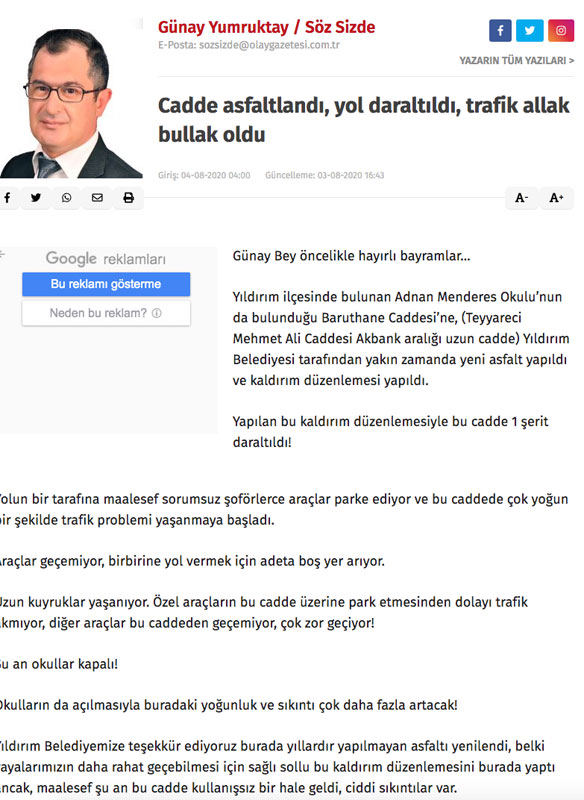 4 Ağustos 2020 tarihli gazetenizin Söz Sizde köşesinde yayımlanan “Cadde Asfaltlandı, Yol Daraltıldı, Trafik Allak Bullak Oldu” başlıklı okur şikâyetinde, Belediyemiz tarafından Baruthane Caddesi’nde yapılan asfaltlama ve kaldırım çalışması sonucu yolun daraldığı ifade edilerek oluşan trafiğe çözüm bulunması talep edilmektedir.