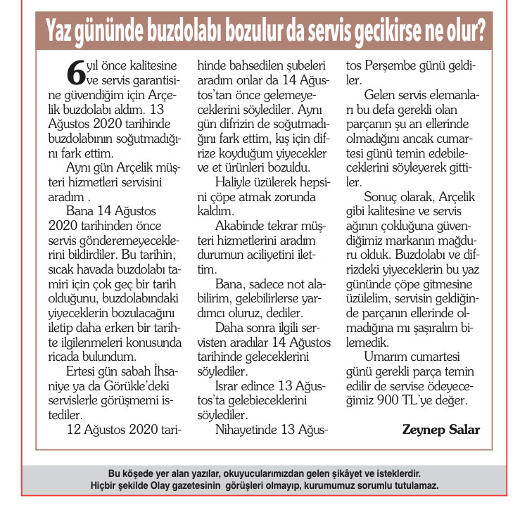 Günay Bey, vatandaşın sesi olan Söz Sizde köşenizde 15 Ağustos 2020 tarihinde “Yaz Gününde Buzdolabı Bozulur da Servis Gecikirse Ne Olur?” başlığıyla mağduriyetimi ifade eden bir yazım yayımlanmıştı.